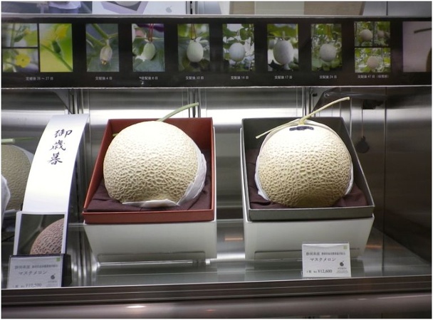 ・アメリカの価値にするとりんごが1個21ドル、四角いスイカが212ドル、イチゴの単価が69ドル、さくらんぼが1箱160ドル、ぶどうが一房64ドル、フルーツセットが170ドル、丸いスイカが127ドル、メロンが160ドル(2個で265ドル)だ。高額すぎるだろ。