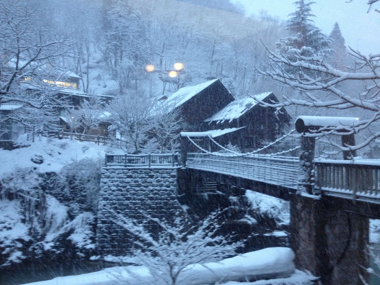 4月なのに雪!予想外なことに温泉に到着したら雪が降っていた