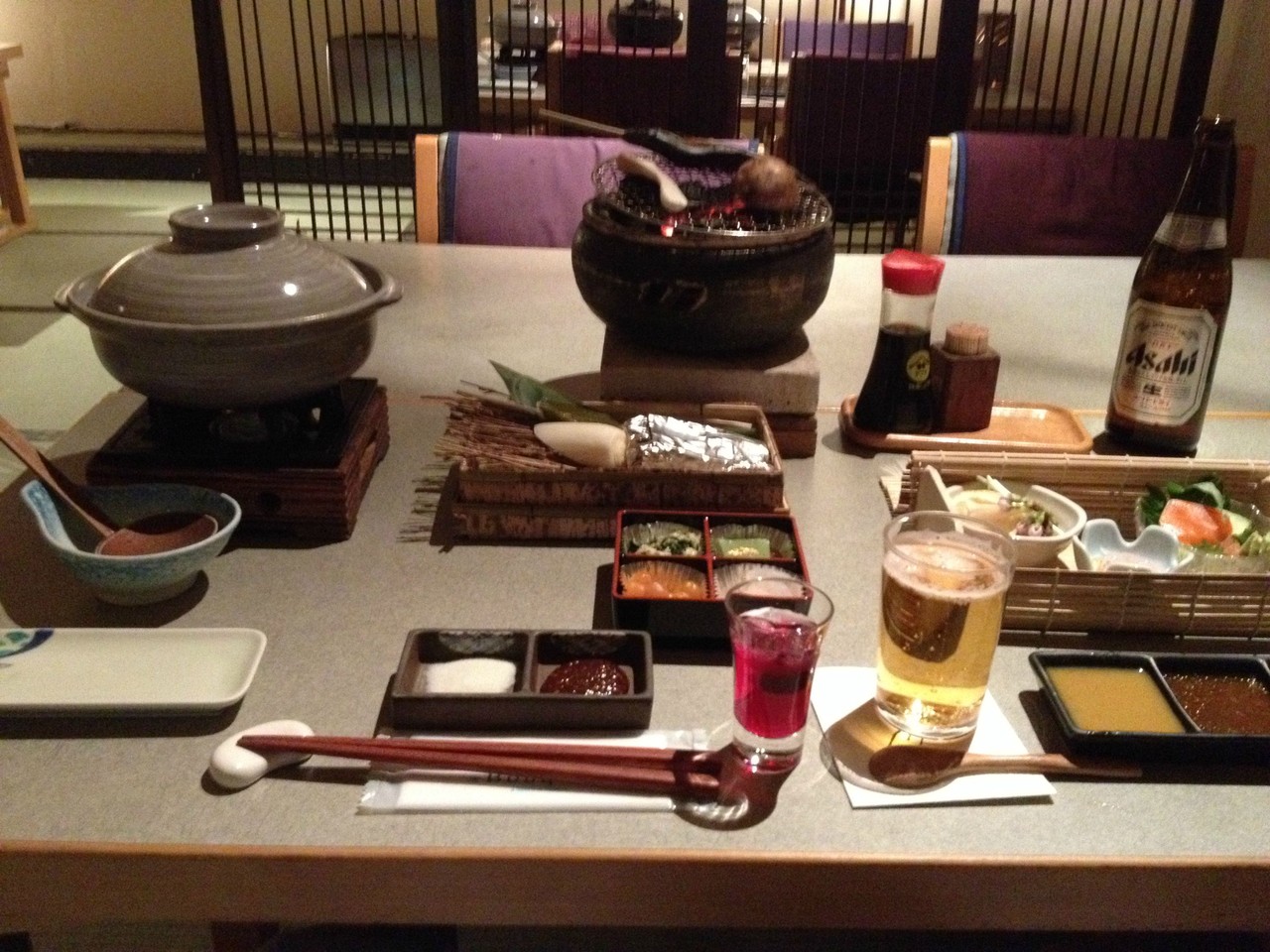 ”フトン”は短かった。わたしは身長173cmなのに足がはみ出てしまうほどだった。夕飯:これで全部じゃなかった!あとから天ぷらなど色々出てきた。アサヒスパードライは美味い。