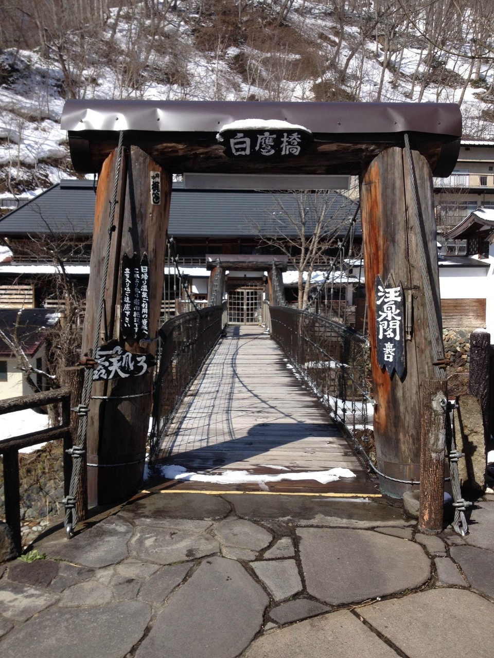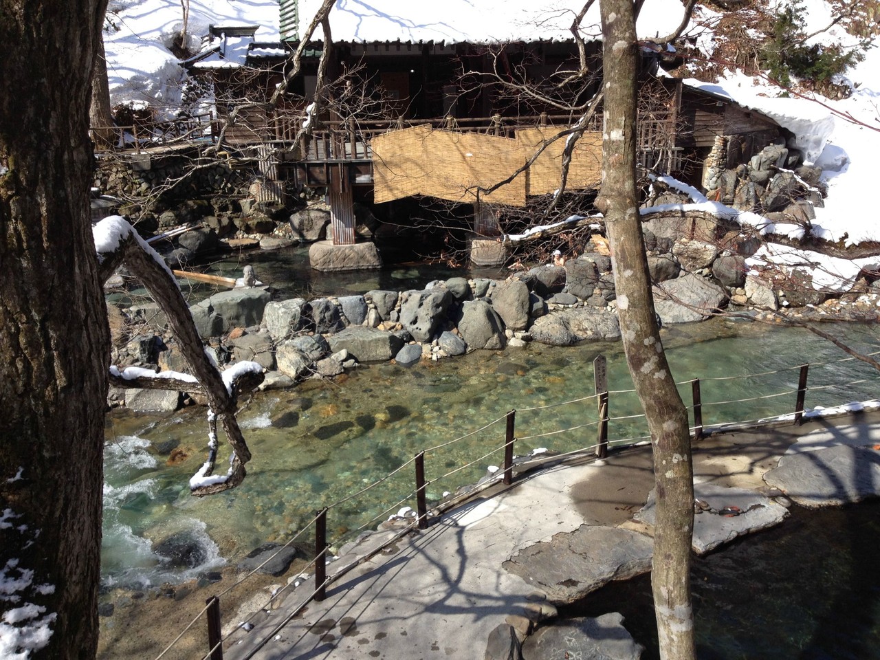 露天風呂へ行くには雪の橋を渡っていかなくてはならない。