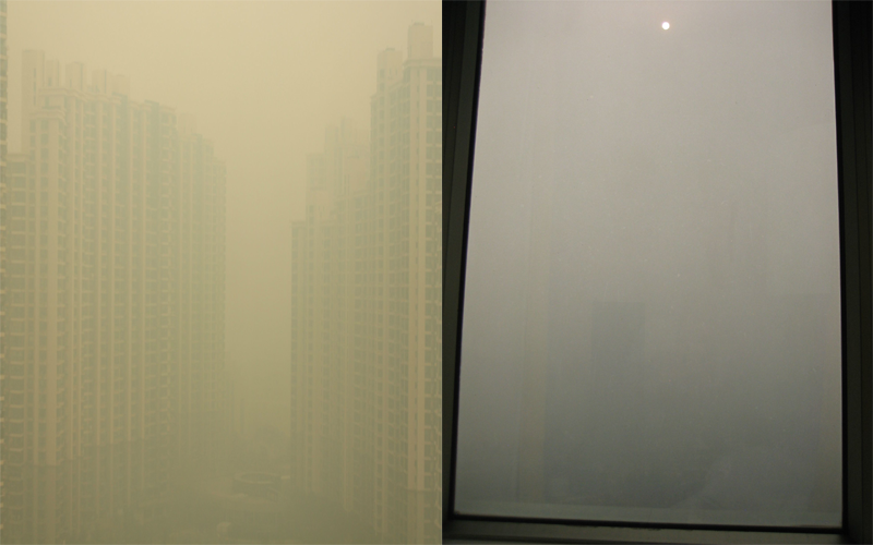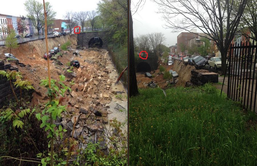 ①土砂崩れの道路にて、お互いの姿が写り合っている