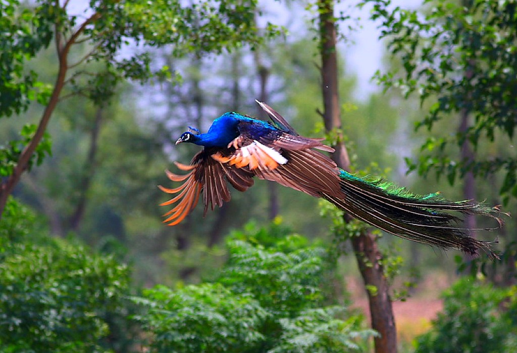 羽根を広げるクジャクも綺麗ですが飛んでるほうが神秘的ですね