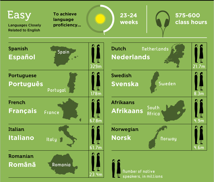 スウェーデン語やその他スカンジナビア言語(フィンランド語とアイスランド語以外)オランダ語、ドイツ語、イタリア語、スペイン語、フランス語は簡単だと思う