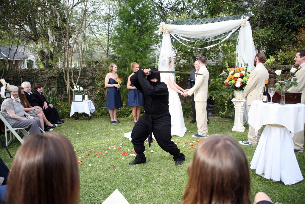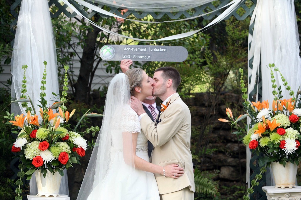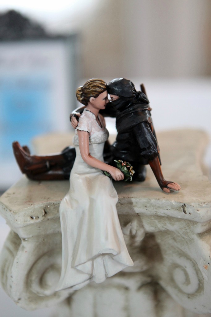 スレッド「ゲーマー同士の結婚式」より。ゲーマーの外国人同士の結婚式が海外で話題となっている。ゲーム仕様の招待状、ウェディングケーキや式場、忍者などのパフォーマンスなど、両者の趣味を前面に出した楽しいものとなっている。