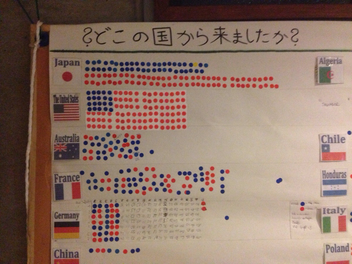 スレッド「泊まってるホステルにあった”どこの国から来たか”のチェックシート。文化は明らかに違うとわかる」より。スレ主の滞在しているホステルにあったという国籍チェック欄が話題となっている。青色のシールが男性、赤色のシールが女性を表している。