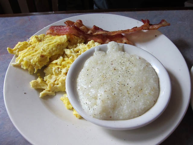 スクランブルエッグ&ベーコン&グリッツ(トウモロコシの粥)