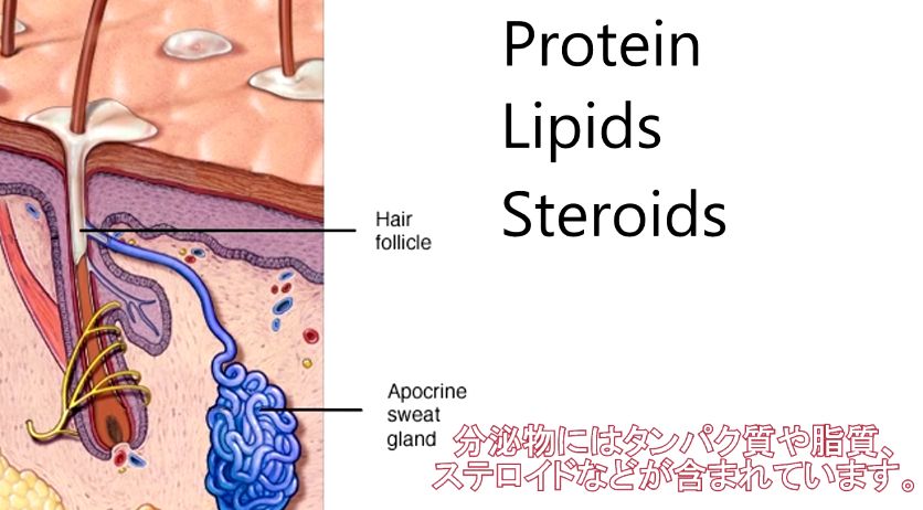 科学的に説明すると、人間の2つの汗腺のうち「アポクリン腺」から出る汗にはタンパク質や脂質、ステロイドが含まれている。汗自体は無臭なのであるが、ここに細菌が集まり特有の臭いが発生するという。