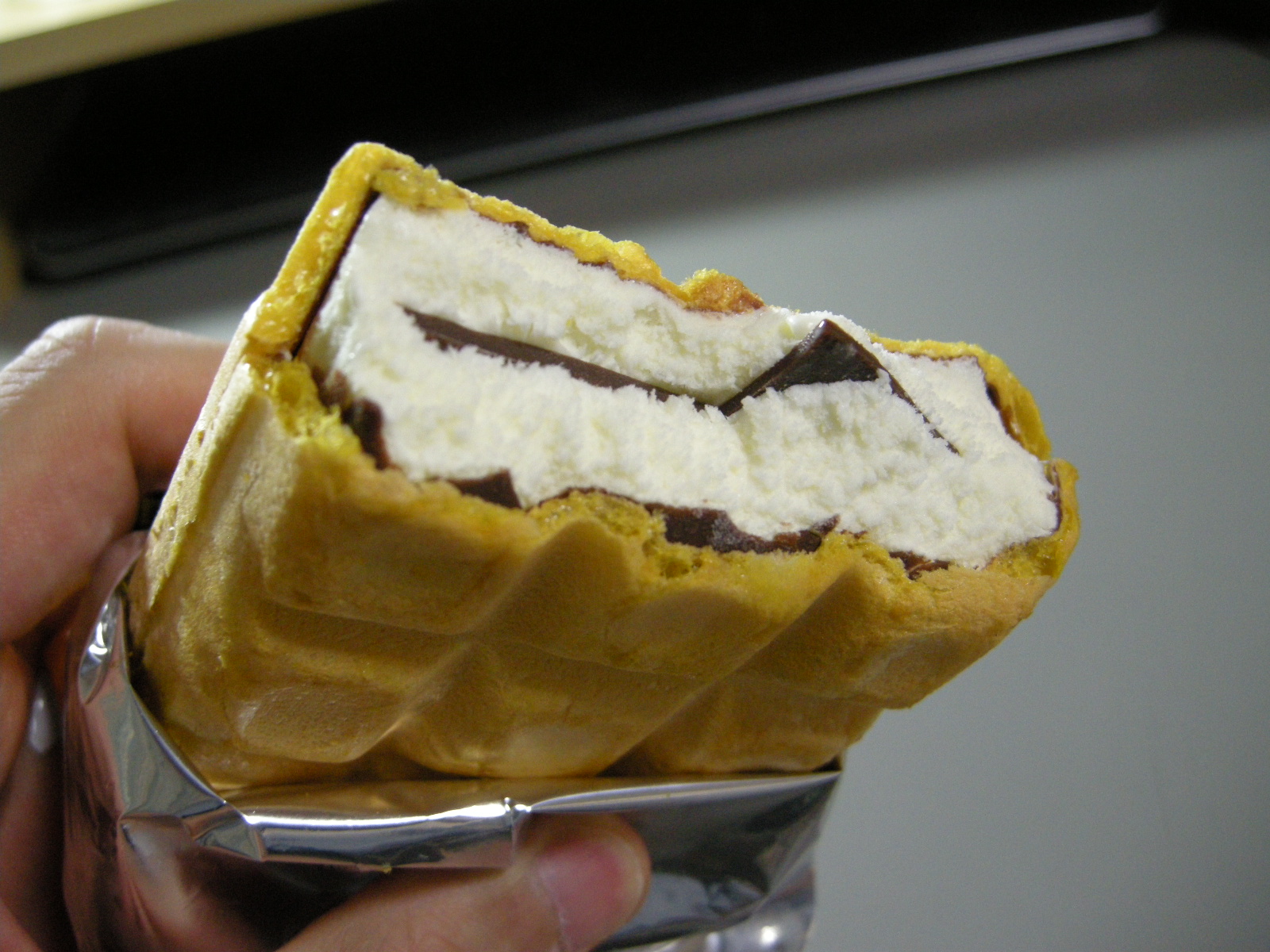 薄硬いチョコが波打ってて間にバニラがはさんであるやつ