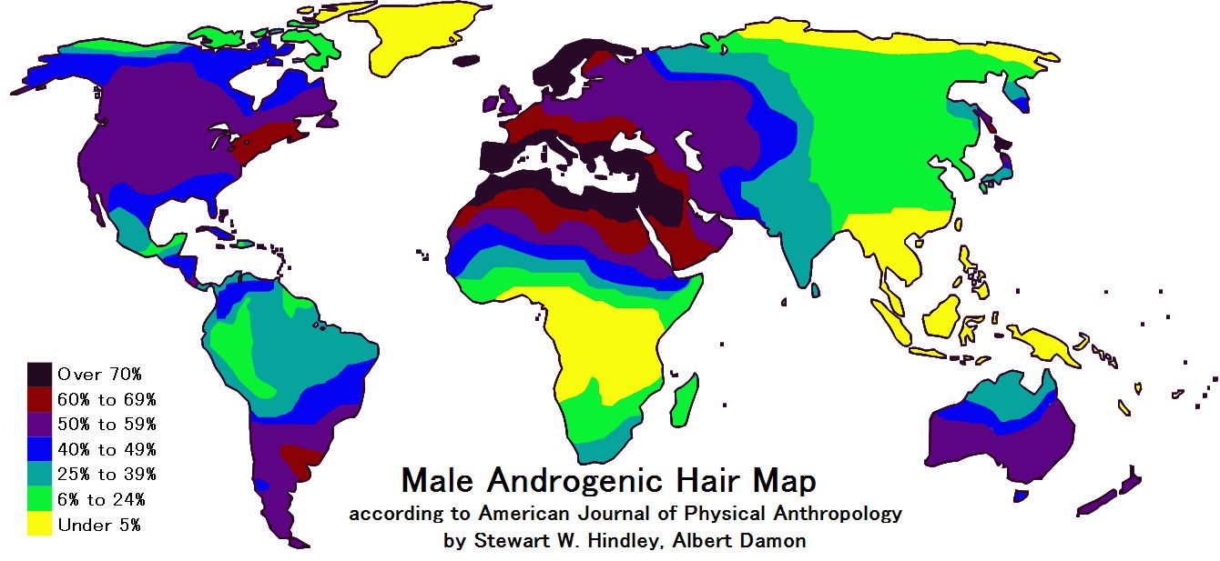 カムチャッカの人々は結構毛深いらしい(※男性の体毛の濃さを表した世界地図)