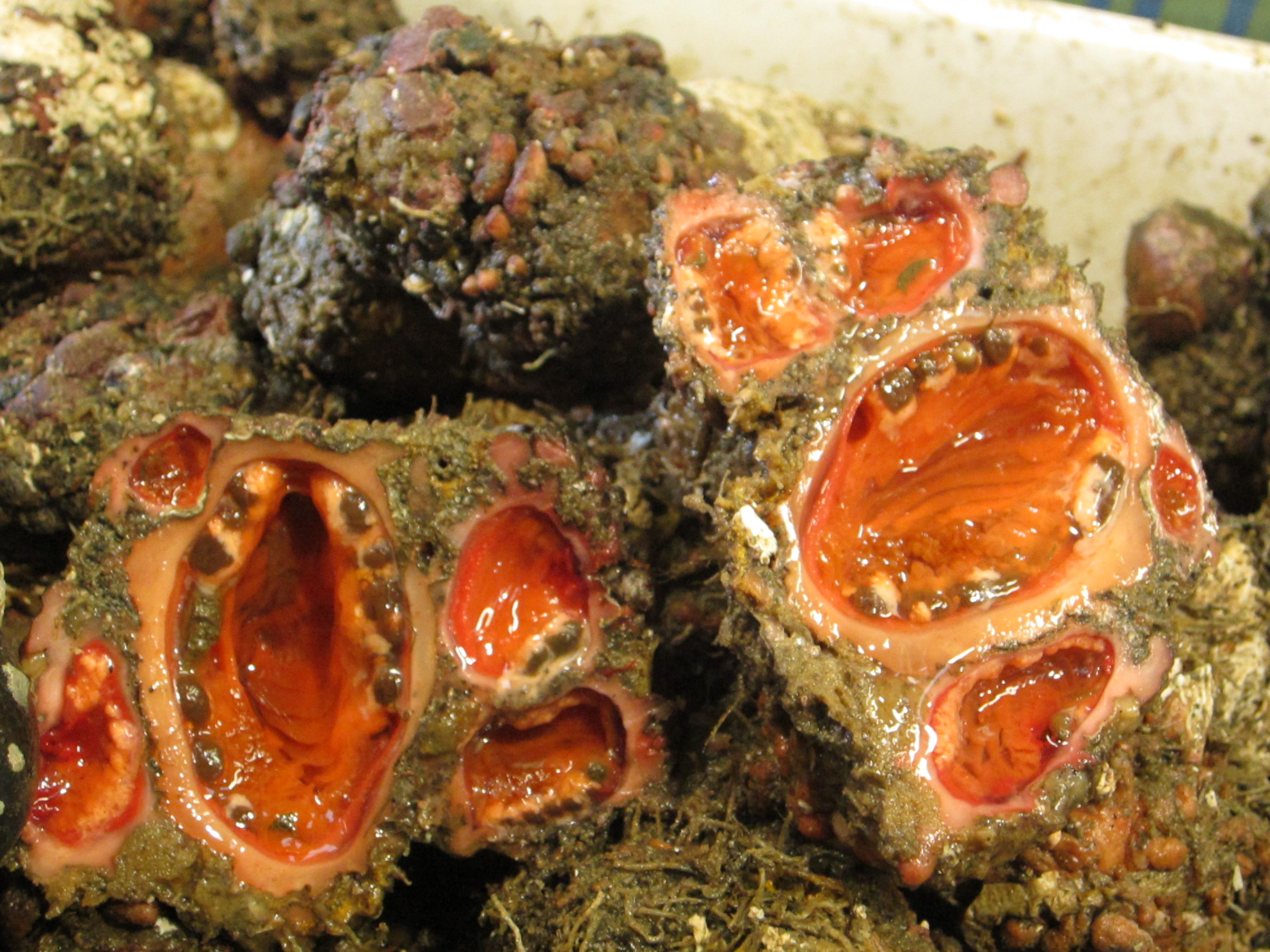 「Pyura chilensis」と呼ばれるホヤ綱に属する被嚢(ひのう)類で、チリおよびペルーの岩だらけの海岸に生息している。その外見から「鋼鉄のホヤ」とも呼ばれている。中身を保護するため、固く分厚い動物繊維素(被嚢)が体外を覆っている。その固い被嚢をパカっと割ると、中には、真っ赤な体液と筋肉、内臓組織が入っている。