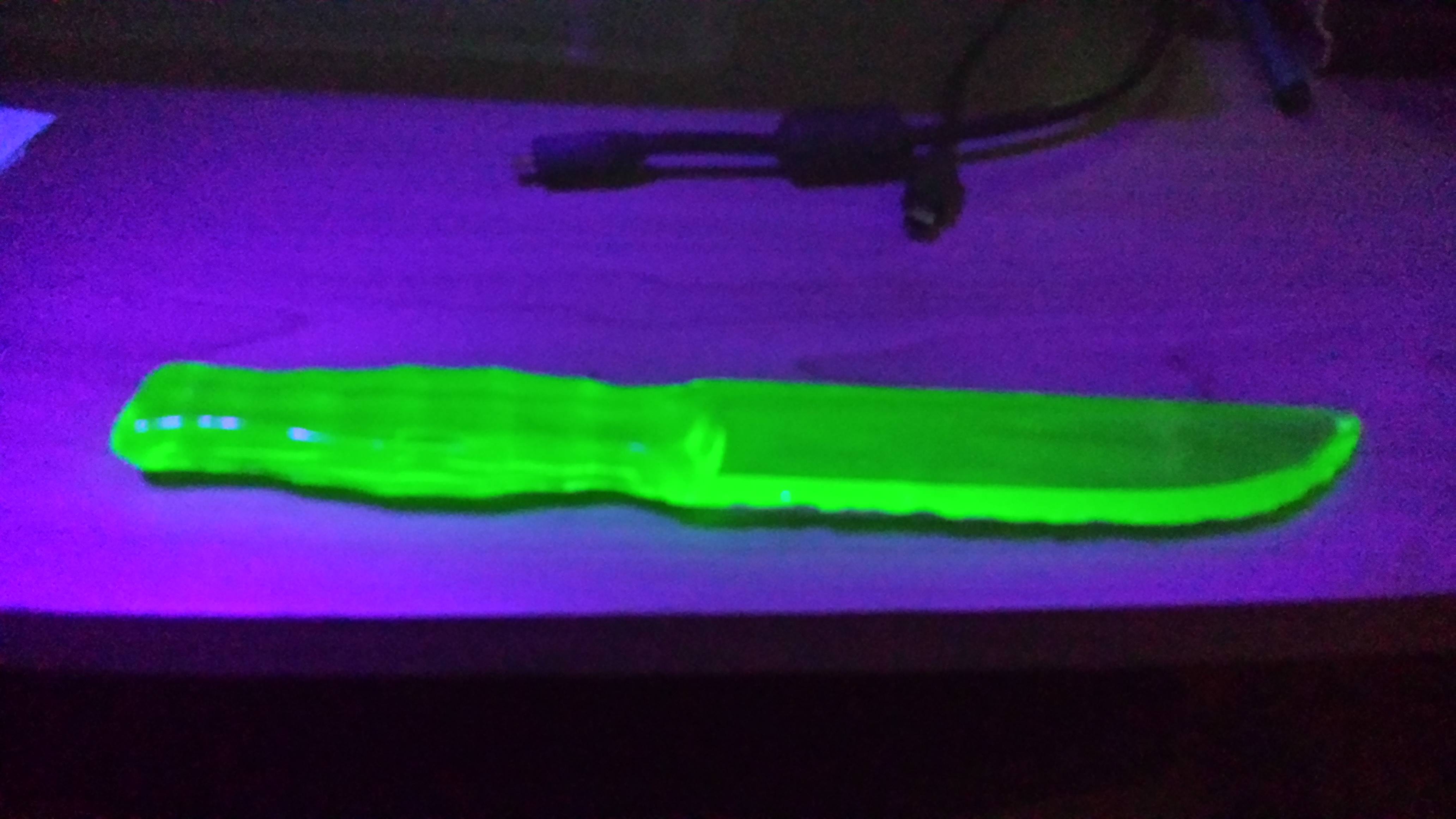 ちなみにその時のガラス片も持っていて、紫外線を当てればそれも緑色に光るよ