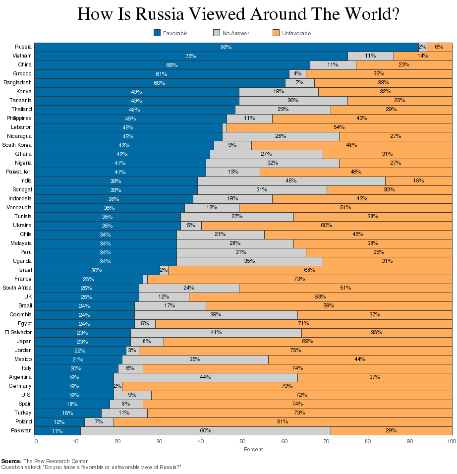 スレッド「ロシアはお好きですか?」より。ロシアに対する好感度を表したグラフが話題となっている。青が好意的な意見、灰色が無回答、オレンジが否定的な意見となっている。日本はロシアに対する好感度がやや低めで好意的23%、無回答8%、否定的69%となっている。