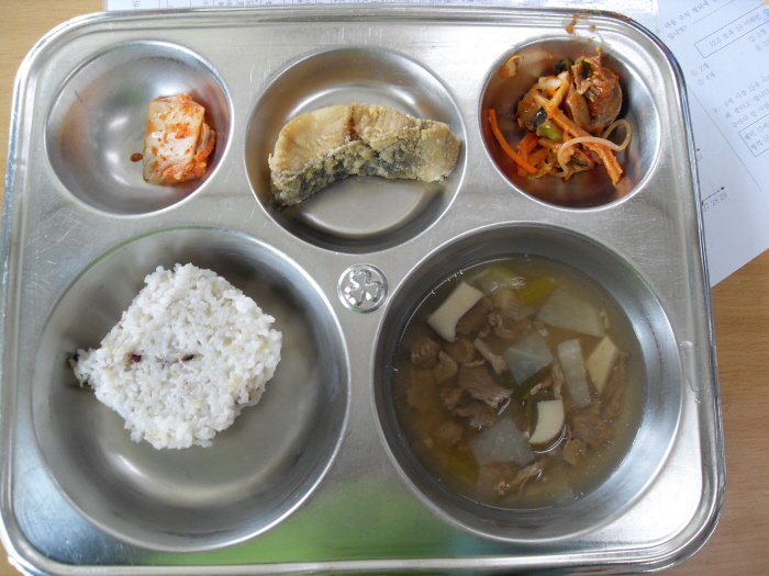 >韓国の学校は、心のこもった魚のスープと発酵したキャベツ、キムチ