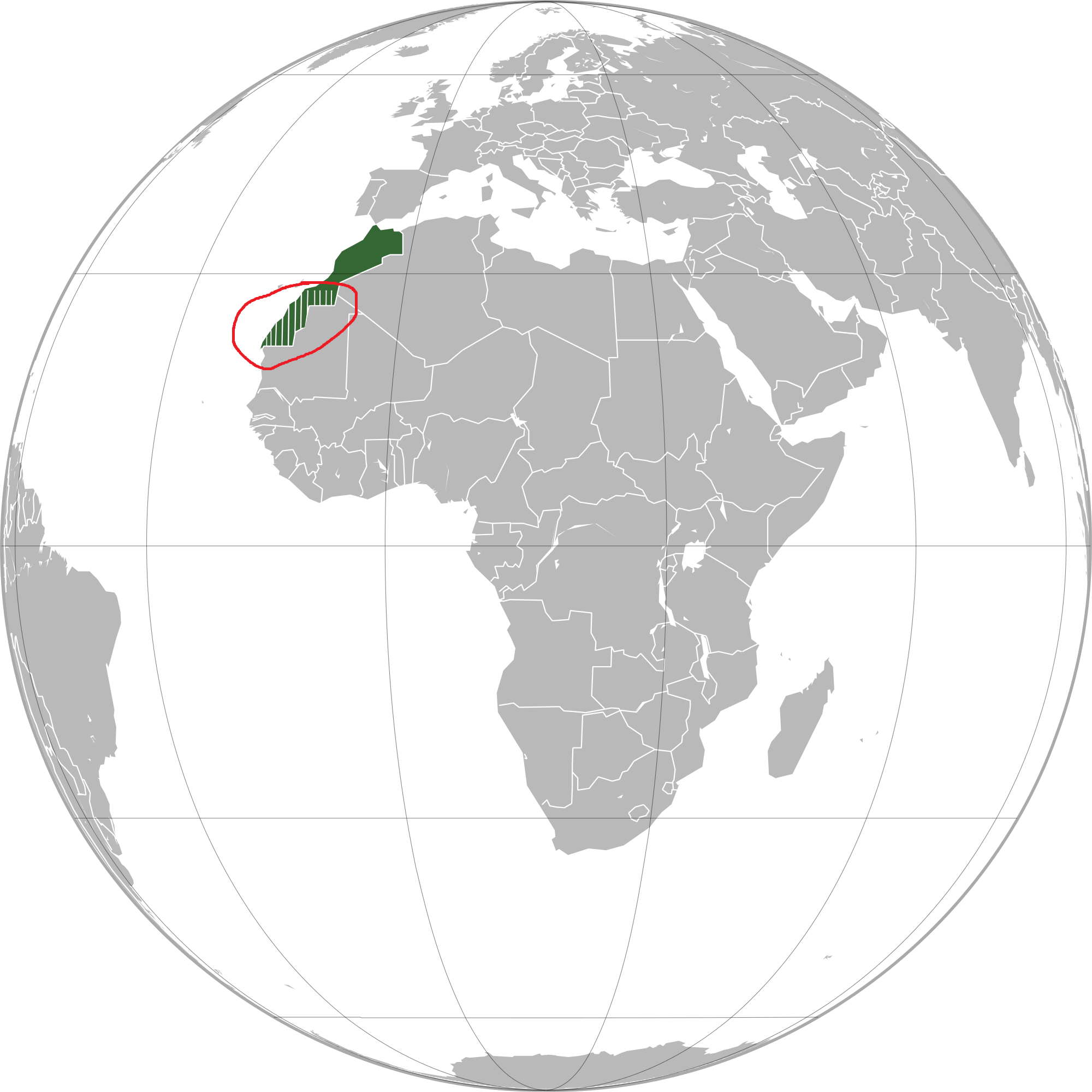 西サハラ:アフリカ大陸北西部の大西洋岸にある地域で、1969年まではスペイン領サハラで、リオ・デ・オロとサギア・エル・ハムラ地区より成っていた。面積26万6000平方キロメートル、人口約27万人(2004年)。帰属については議論があり、亡命政権であるサハラ・アラブ民主共和国とモロッコ王国が領有を主張している。国際連合の「非自治地域リスト」に1960年代以来掲載されている。多くの地域をモロッコが実効支配(不法占拠)しているが、モロッコによる領有権の主張は大多数の国から認められていない。しかし、欧米や日本などの先進諸国はモロッコとの関係上からサハラ・アラブ民主共和国を国家としては承認しておらず、また同国は国際連合にも加盟できていない。(http://ja.wikipedia.org/wiki/西サハラ)