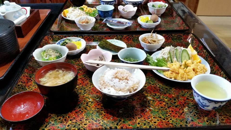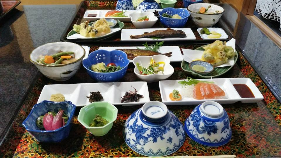日本の伝統的な旅館で食べる夕食と朝食のハイライト。よくわからない物もあったが、野菜の天ぷらをタレにつけて食べたのは美味しかった