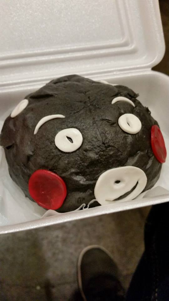 くまもんの形をしている肉まん(蒸しパンの中に豚肉が入ってる)。締りのない食べ物だが、それがいい。