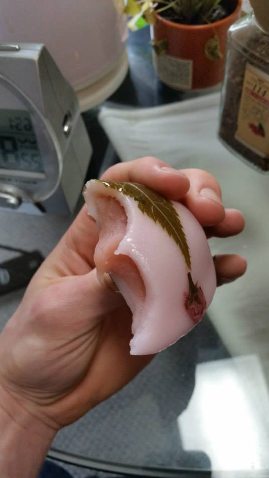 さくら味の餅、本物の葉っぱで包まれていて風味をつけている