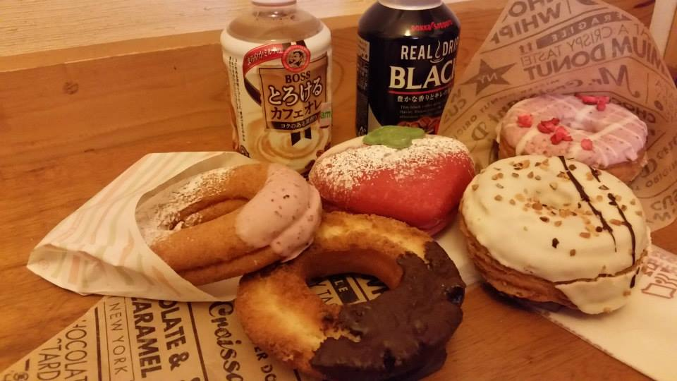 日本の有名ドーナツチェーン、ミスタードーナツのドーナツを広げてみた写真。後ろの3つは桜が咲いている時期の特別なドーナツ。