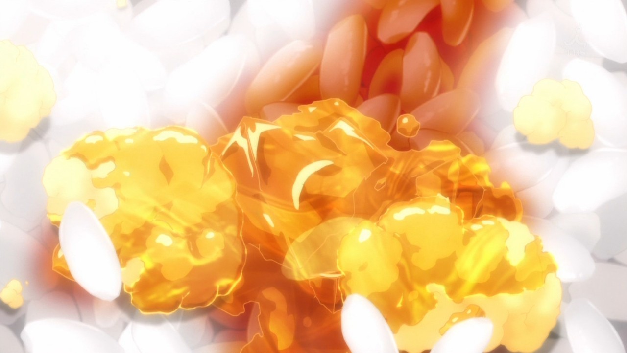 補足:食戟のソーマにおける”ふりかけごはん”:卵そぼろとキューブ状の小さな煮こごりを「ふりかけ」としてごはんの上に乗せた料理。ごはんの熱で煮こごりを溶かすことによって、卵全体に味を行き渡らせる食べ物として作中で登場する。