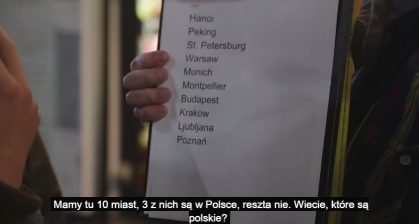 10個の世界の都市のうち3つポーランドの都市が分かるかという問題。選択肢はハノイ・北京・サンクトペテルブルク・ワルシャワ・ミュンヘン・モンペリエ・ブダペスト・クラクフ・リュブリャナ・ポズナン(赤が正解)。ワルシャワを中心に概ね正解。