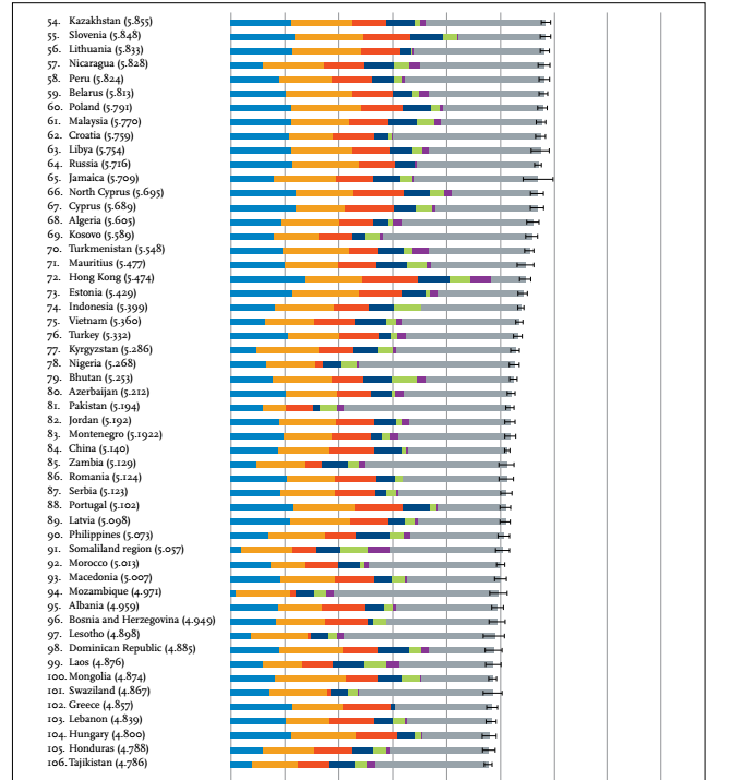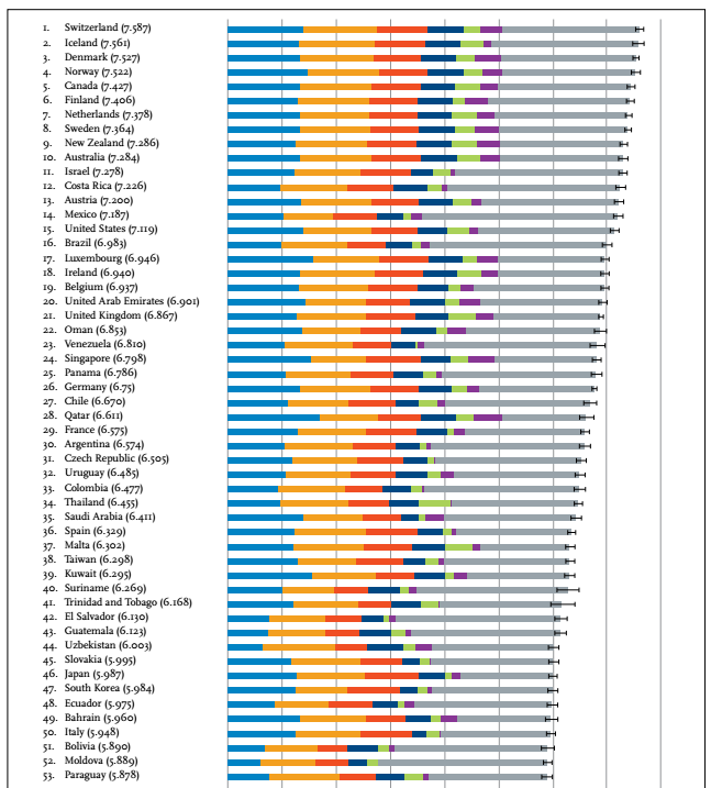 ちなみに水色=一人あたりGDP、黄色=社会保障、赤色=健康寿命、紺=人生選択の自由度、黄緑=寛容度、紫=汚職度、灰色=政治的自由度。
