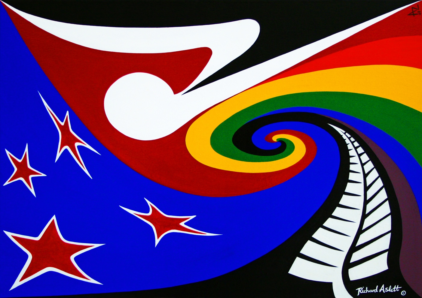 国の現状を表すなら16が一番近いんだろうけど(一応植民地としての歴史は受け入れて青赤白の色合いも残し、マオリの文化とヒッピー文化と自然と海洋を強調)、あまりにも煩雑。