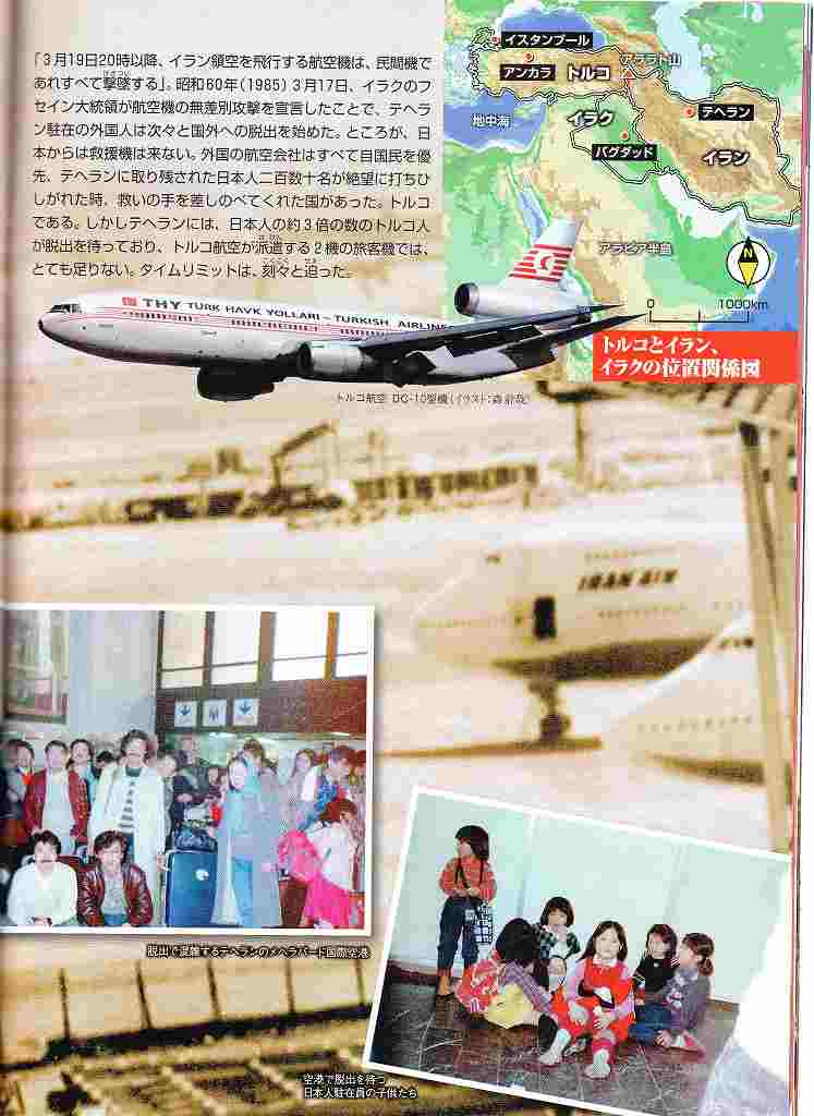 イラン・イラク戦争の1985年3月12日、イラク軍によるイランの首都テヘランに対する空爆が始まった。フセイン大統領は「3月19日20時半以降はイランの上空を飛ぶすべての飛行機を撃ち落とす」という声明を発した。宣言後、イランに住む外国人についてはそれぞれが国籍を置く国の軍隊、ないしは民間航空会社を使っての脱出が計られた。在イラン日本人200名以上は脱出方法が見つからずに生命の危機に瀕していた。日本大使館の野村豊大使は、トルコ大使館のビルレル大使に窮状を訴えると大使は「わかりました。ただちに本国に求め、救援機を派遣させましょう。トルコ人ならだれもが、エルトゥールル号の遭難の際に受けた恩義を知っています。ご恩返しをさせていただきましょうとも」と答え、大使の要請を受けて2機のトルコ航空機がテヘランへ派遣された。(http://ja.wikipedia.org/wiki/ターキッシュ_エアラインズ)