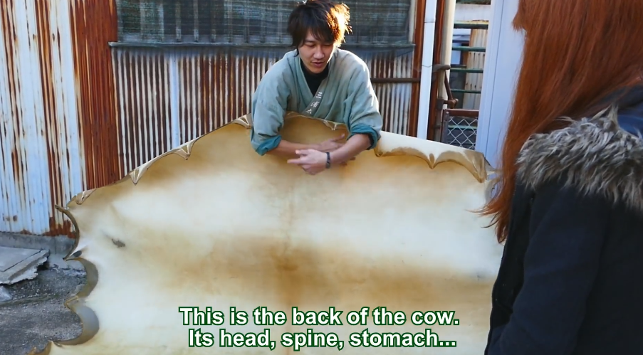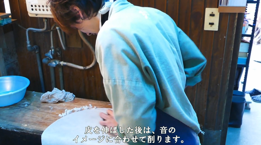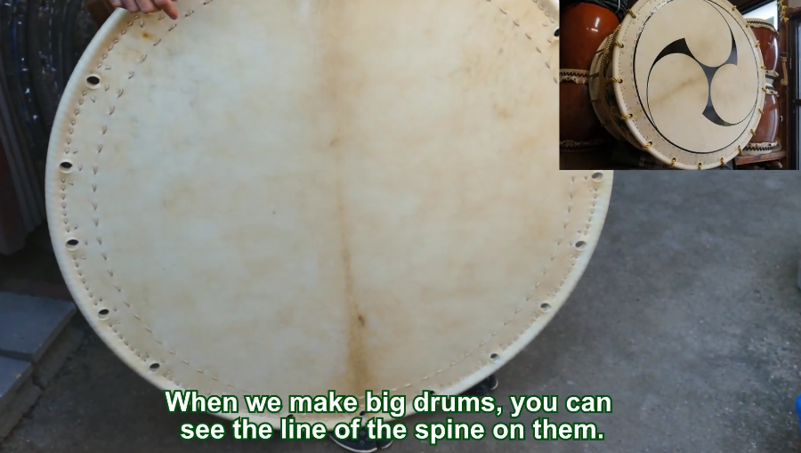 太鼓の音を出す部分は大きな牛の皮から作られる。素材のままだと全ての部位で皮の厚さが違い、決して均一な状態じゃないという。また太鼓の真ん中に背骨の跡がくるように作るという。