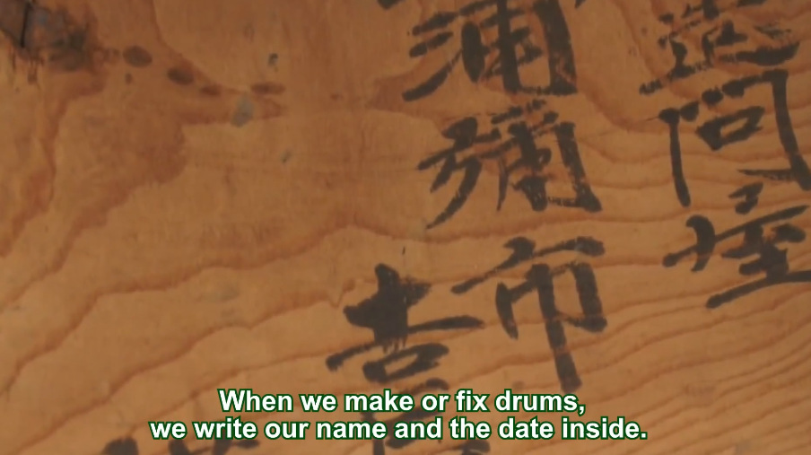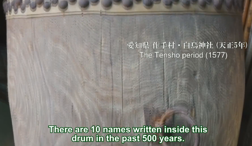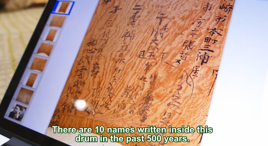 太鼓職人は胴のなかに製作した日付と太鼓師の名前を書くのが慣例となっている。また、修復作業中に歴史ある太鼓を見つけることもあるという。6代目の三浦さんが見たなかで最も古い太鼓は1577年の太鼓であったという。1577年の太鼓は五百年間で10回名前が書き込んであるため、50年ごとに職人が修繕したという歴史がわかる。