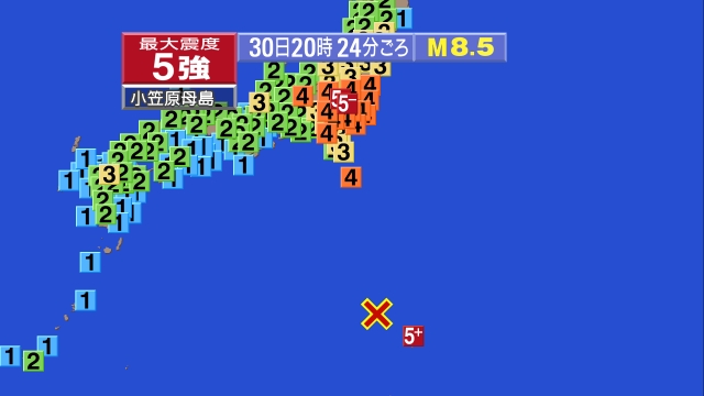 小笠原、神奈川で震度5強=埼玉も震度5弱、津波の心配はなし30日午後8時24分ごろ、東京都小笠原諸島西方沖を震源とする地震があり、小笠原と神奈川東部で震度5強、埼玉で震度5弱の揺れを観測した。震源の深さは約590キロで、地震の規模を示すマグニチュードは8.5。津波の心配はない