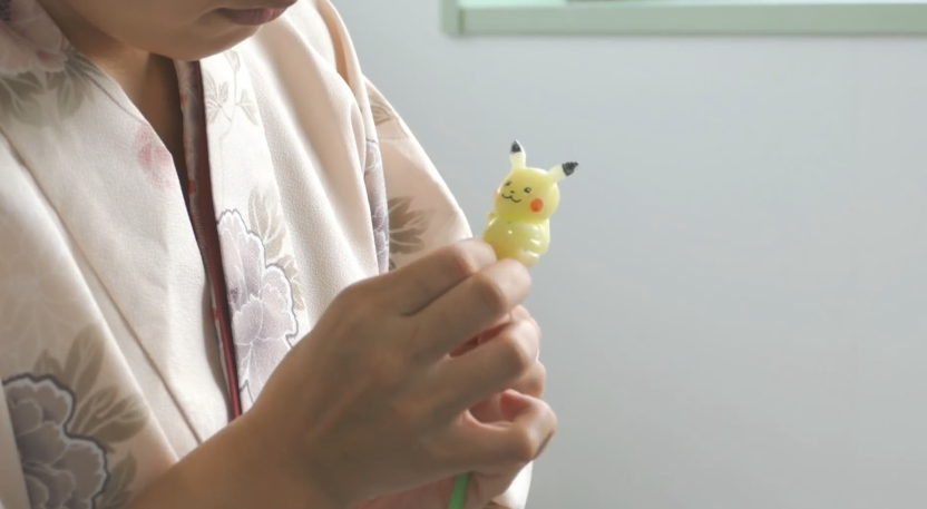 今回実演してくださる山口保奈美さん。彼女は新人(1年目)の飴細工師で緊張して汗が出てきたというもののピカチュウの飴細工をかわいく完成させてくれた。