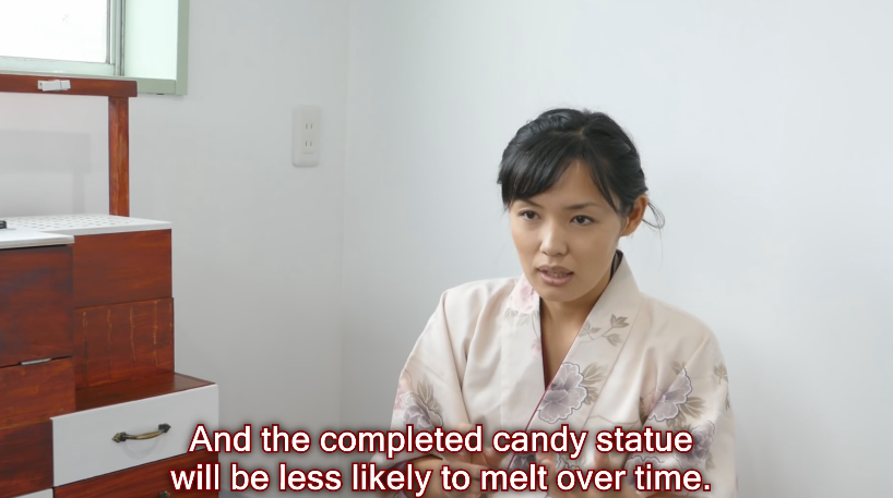 飴細工職人をやるうえで最も難しいの「飴の炊き方」だという。練習すれば飴細工は簡単に出来るが、素材である飴は4~5時間作るのに時間がかかり思ってるほど簡単ではないらしい。また飴の炊き方を知ってるひとが全国にそう何人もいないので、またレシピを絶対教えてくれない人や教えてくれる人まで様々だという。もし飴の配合が分かったとしても温度加減も非常に繊細で難しいとのこと。