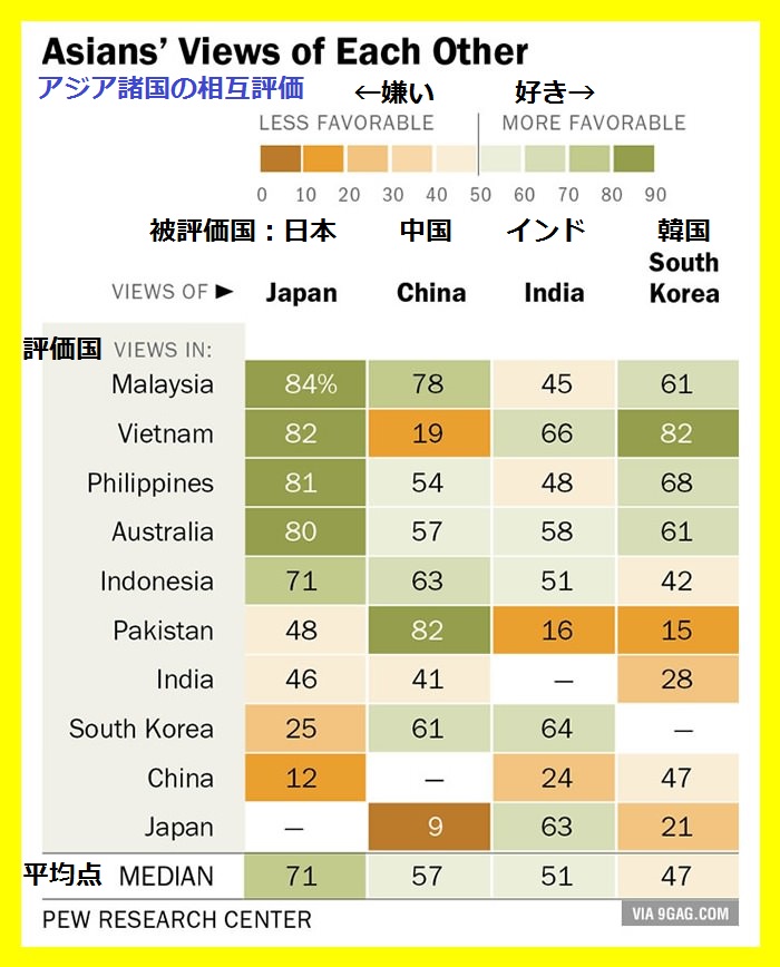 スレッド「アジア諸国の相互評価より。アメリカのシンクタンク、ピュー研究所が発表したアジア諸国から見た日本・中国・インド・韓国の好感度を示した表が話題を集めていたので反応をまとめました。