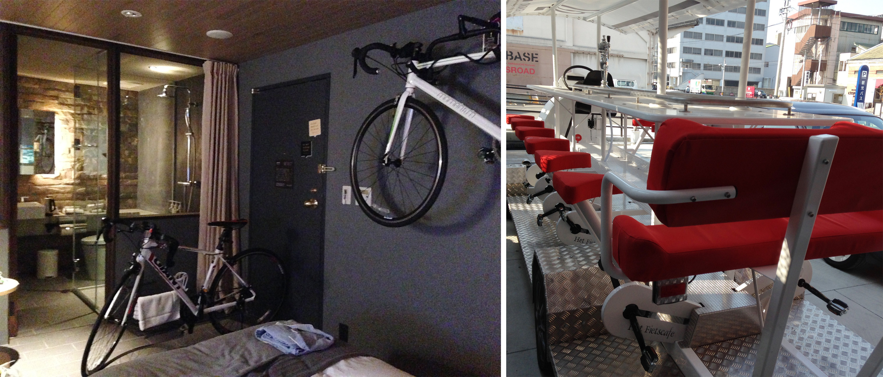 ホテルの部屋には自転車を持ち込めるので何となくクール。右に写ってる機械は「移動式バー」と呼ばれていた。利用客はペダルを漕ぐようで、運転席の後ろにはビールの蛇口があったが、利用する機会が無かった。どうやら特別なイベントの時に使うもののようだ。