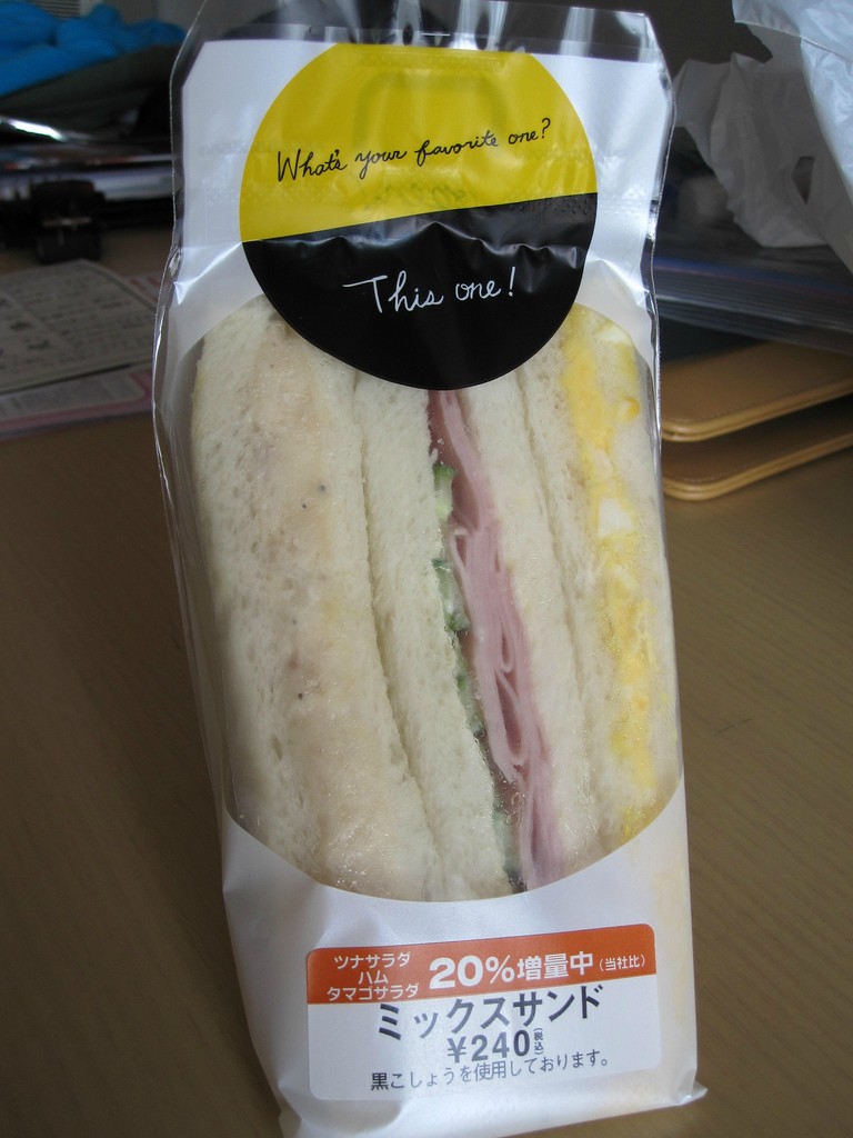 12.コンビニのサンドイッチ:日本にはコンビニ店舗は相当多い。商品は常に新しく美味しくてしかも安い。大抵サンドイッチは3切れ入ってる(これはハム・チキン・たまご)