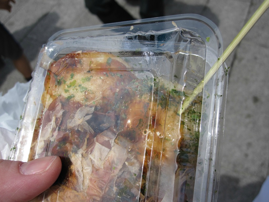 3.たこ焼き。これも屋台で買った。タコの入ったクレープのような粉物。甘じょっぱいソースとカツオの干物のフレークがかかっている。