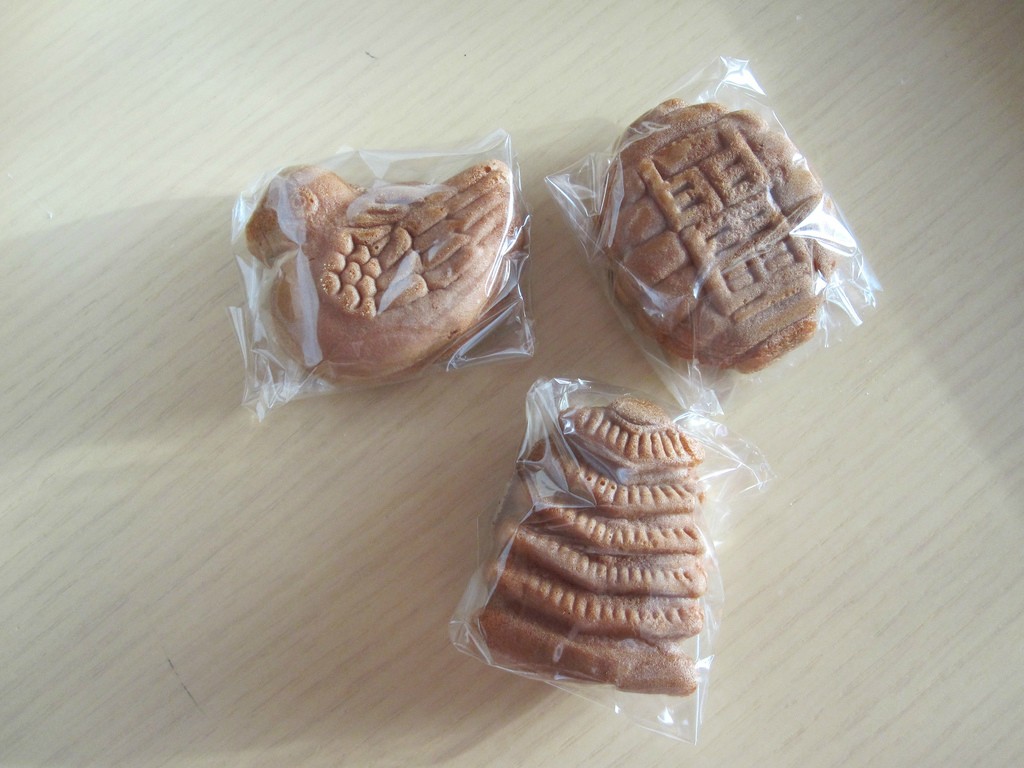 14.神社周辺やおみやげ屋で買えるお菓子。甘く味付けされた小豆ペースト(あんこ)が入ってる。