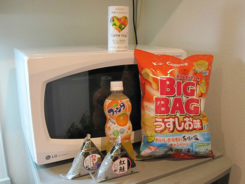 13.おにぎり、ファンタ、ポテチ、野菜ジュース:来日初日にセブンイレブンでコンビニで買ったもの一覧。おにぎりは三角に成形したライスを海苔で包んだもの。中に特定の具材が入ってる。