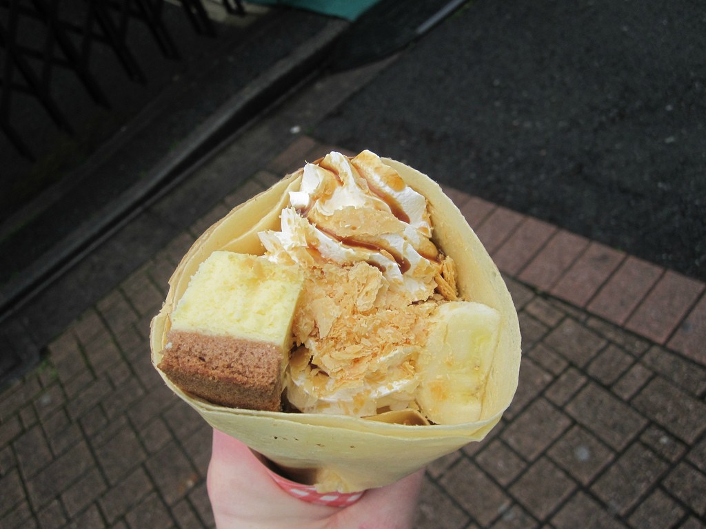 18.原宿のクレープ。家に帰る前の女子学生に人気の店のようだった。チーズケーキ、キャラメルソース、バナナ、ホイップクリームが入っている。約5ドルだけど量は相当多い。