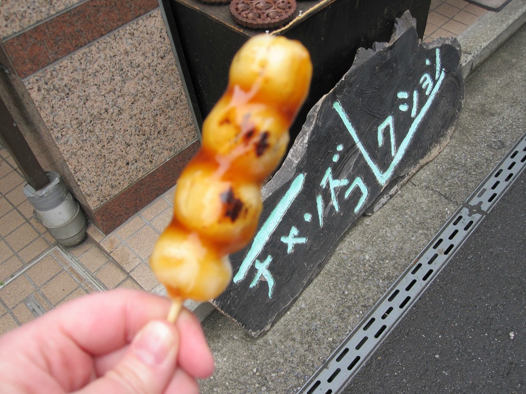 6.ボール状の餅を焼いて甘いソースで味付けした食べ物。鎌倉の露店で売っていた。餅は米を練って作られている。
