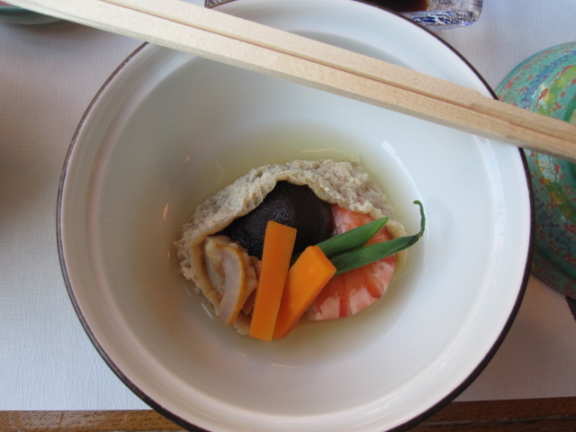 27.油揚げという豆腐の袋に包まれた野菜と海老。繊細でエレガントなお味。