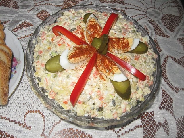 (※オリヴィエ・サラダ:ロシア発祥のジャガイモ、鶏の胸肉、固ゆで卵、キュウリ、ニンジン、キュウリのピクルスなどの野菜を材料に使ったサラダ)