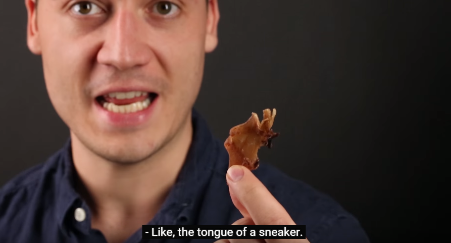 イカの干物(8人中1人が評価) :「日焼け後に肩から剥がれる皮膚のよう」「スニーカーの舌のような物体」「私はゴムを食べてるのかしら?」「2時間噛んだチューインガムを噛んでいるようだった。すごく固い」「魚とスペアタイアが交尾して生まれた赤ちゃんを食べてる感じ」「ノーサンキュー」