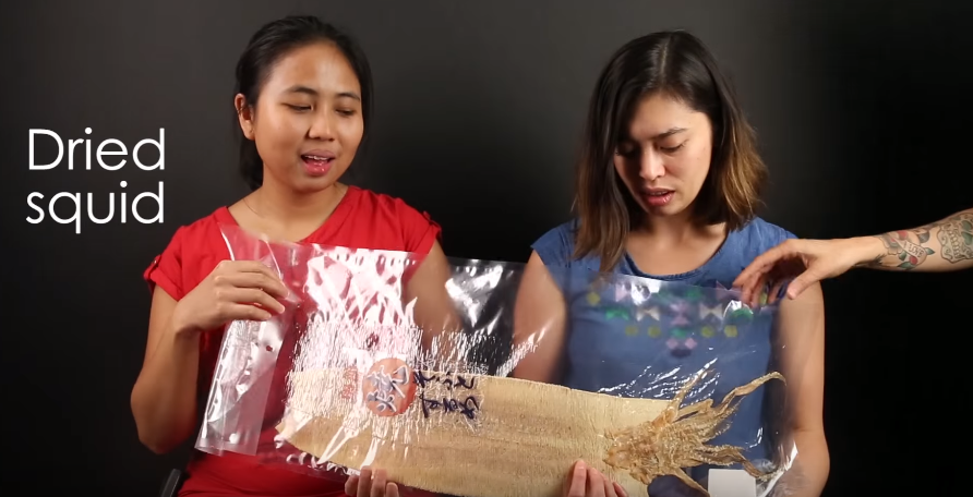 大きなイカの干物:「すごく固い」「ある意味紙のような食感」「匂いはすごく魚っぽいけど、味は魚っぽくはない」「ビーフジャーキー」「まず匂いで食べる意欲が無くなると思うけど、1度食べてしまえばそこまで不快な要素はない」「誰ともデートしたくない時にこれを食べたい。息がイカの匂いになるから誰もキスしたくなくなる」