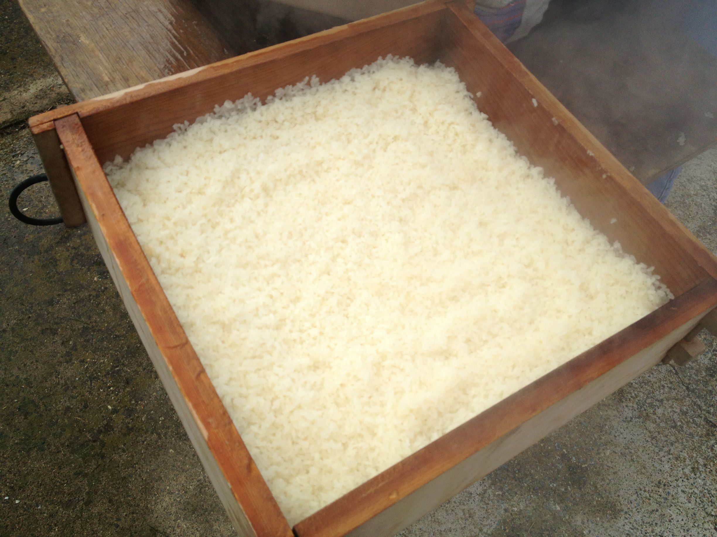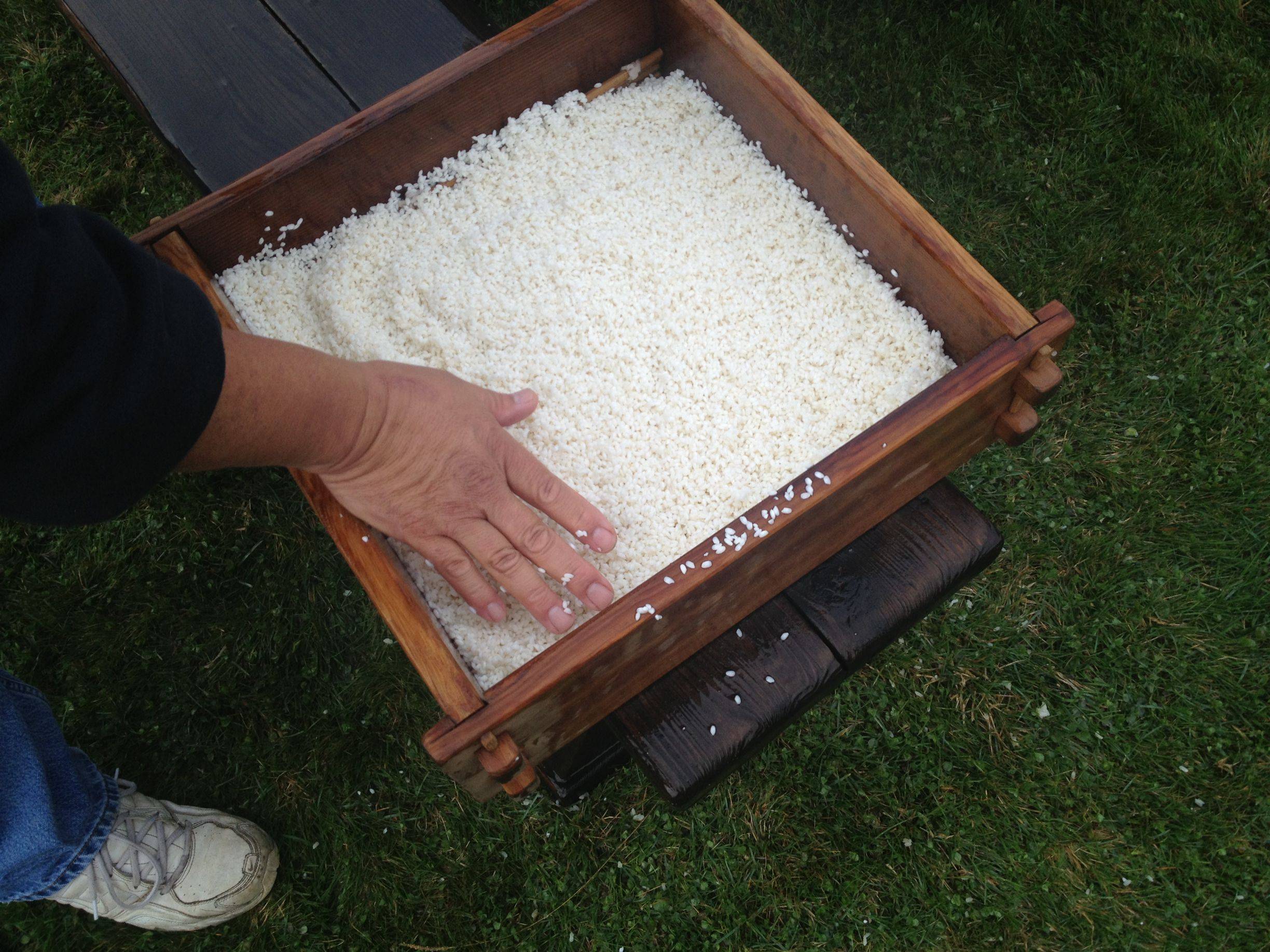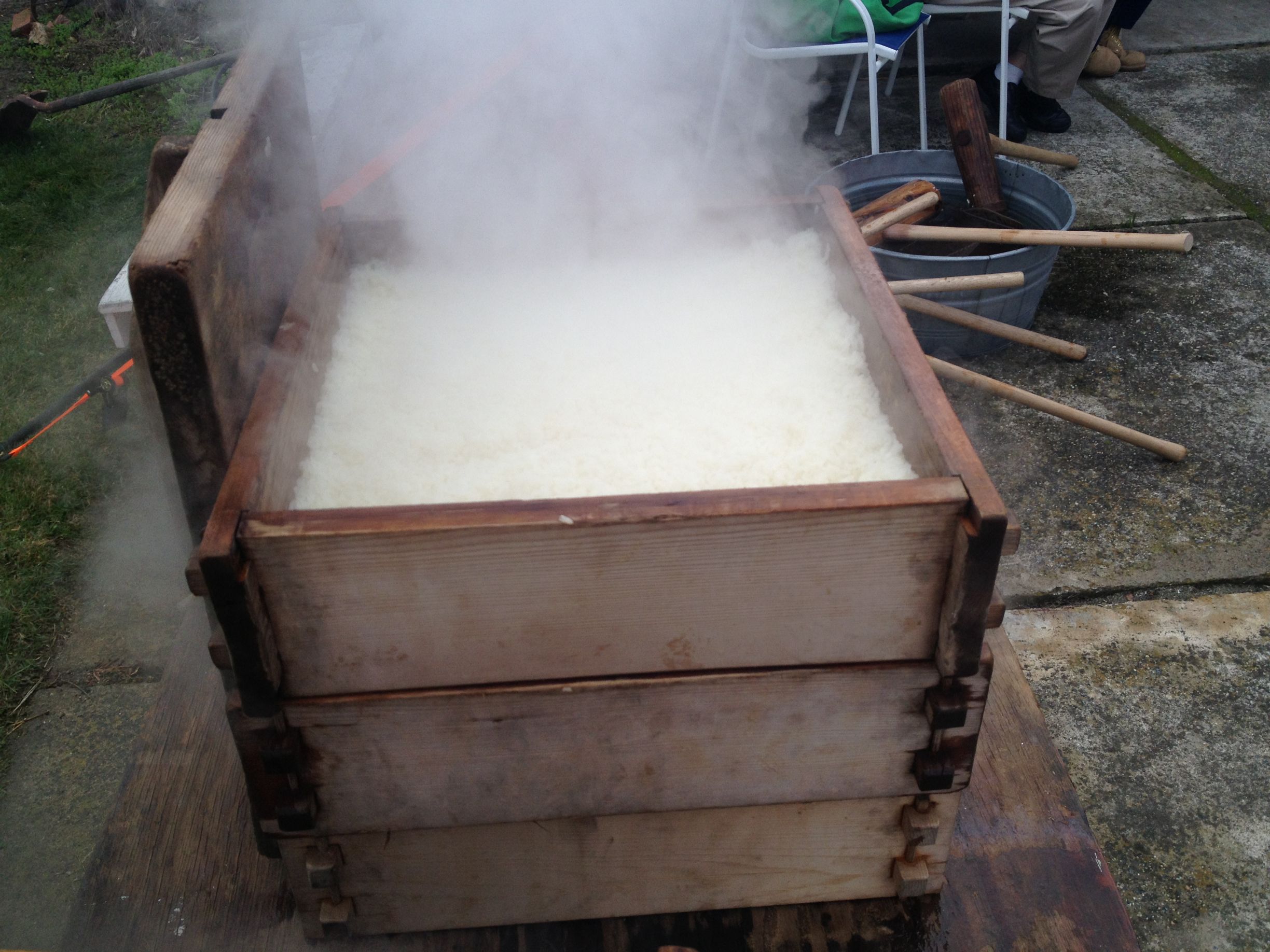 10.蓋をあけると蒸したてのもち米が出てくる。箱から取り出し、これをつくことで餅になる