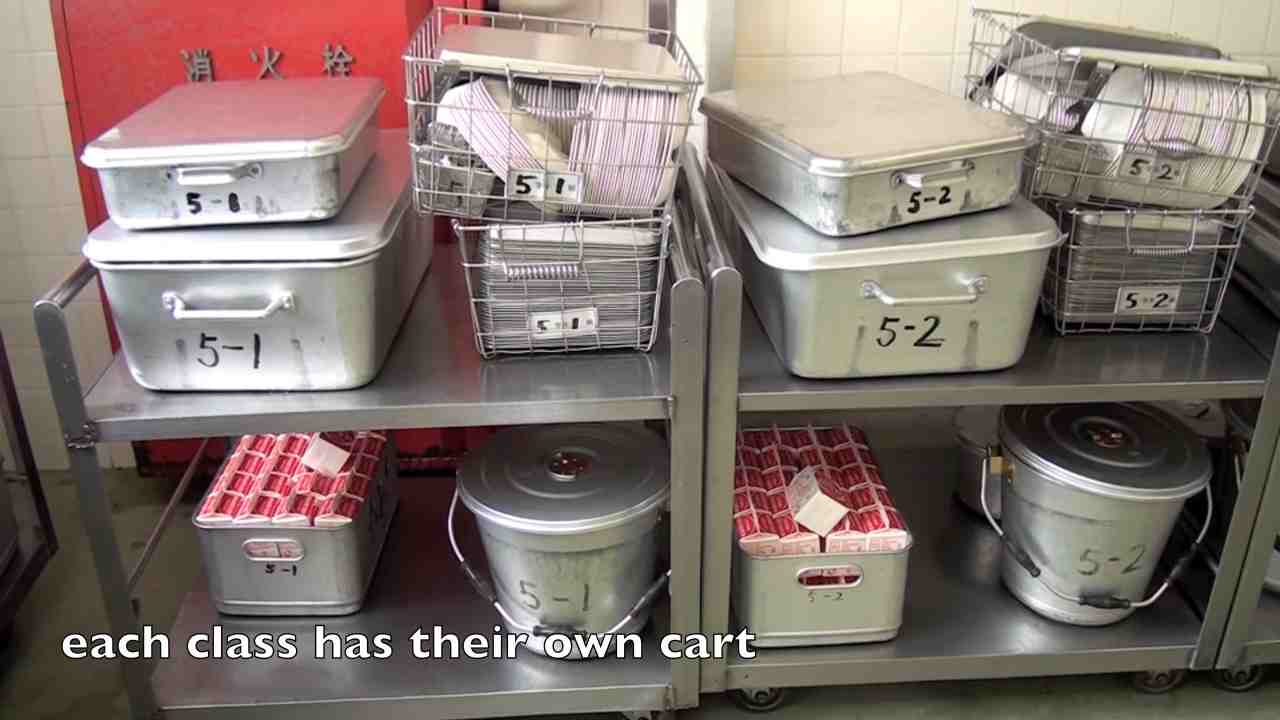 ・同じ分量の給食がクラスごとの配膳カートに乗せられ、子供たちがこれを教室まで押していく