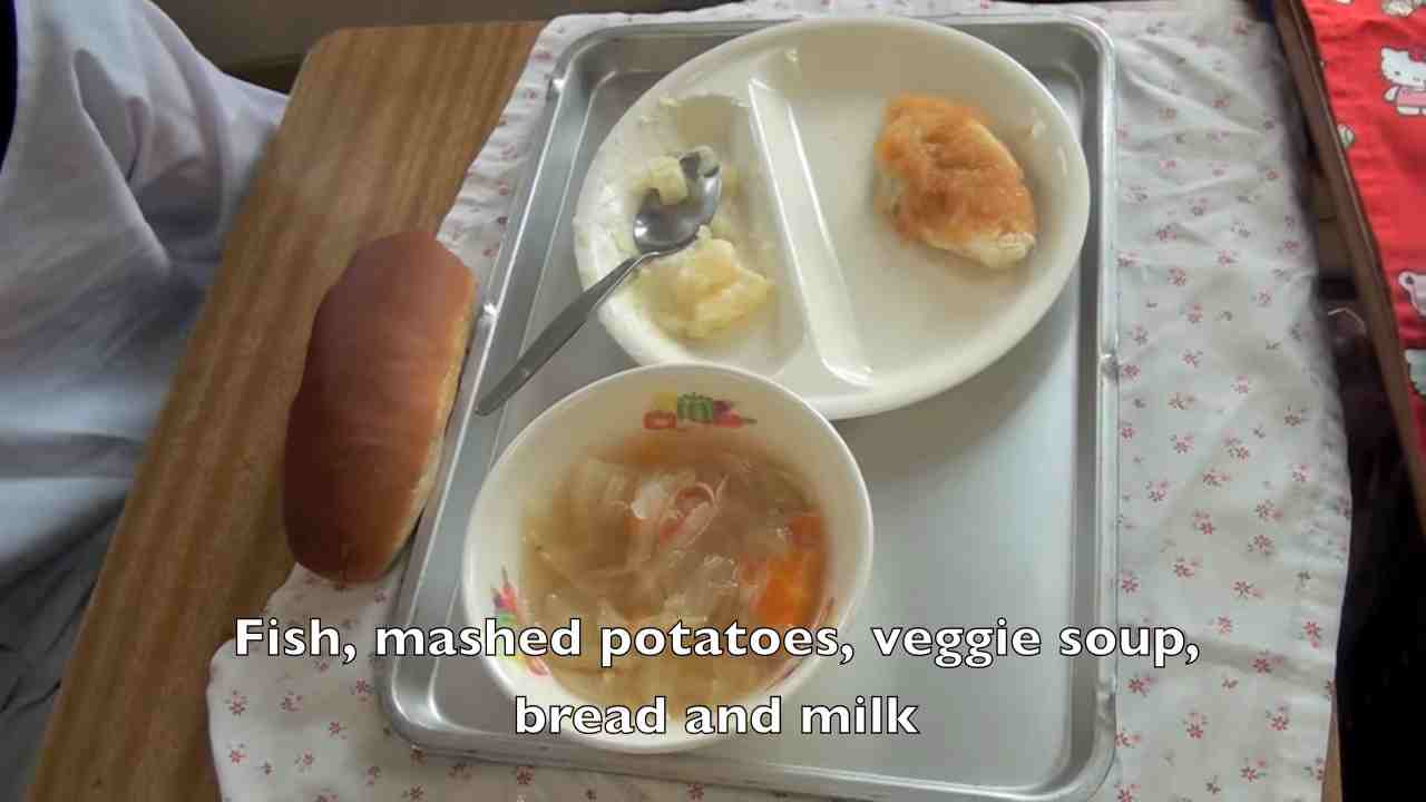 ・この日のメニューは魚・パン・野菜スープ・マッシュポテト・牛乳。余った給食はじゃんけんで争う