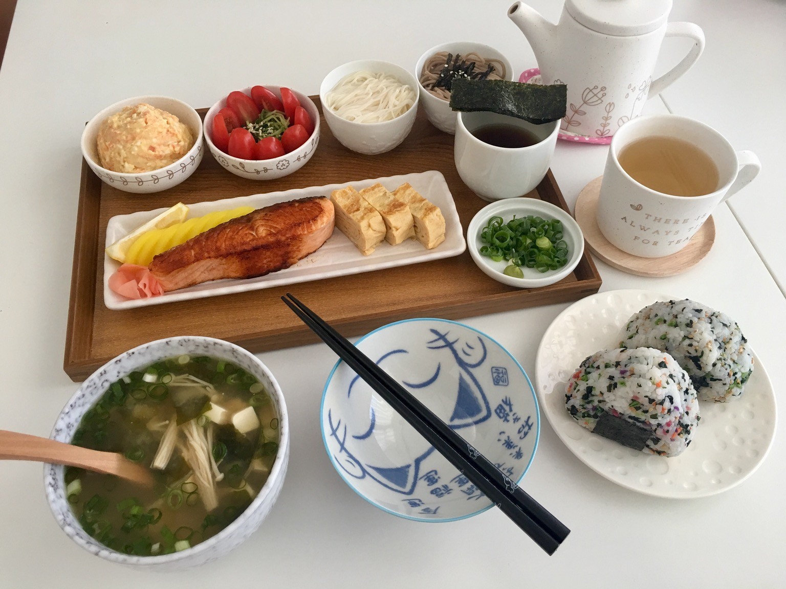 彼女が作ってくれた鮭とおにぎりの日本風ランチ!