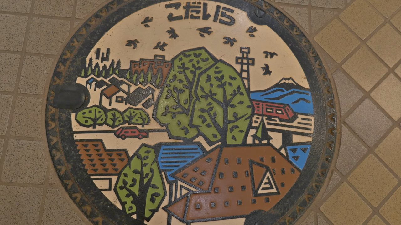小平市でやっと見つけたマンホールには首都圏郊外の平和な生活を描かれています