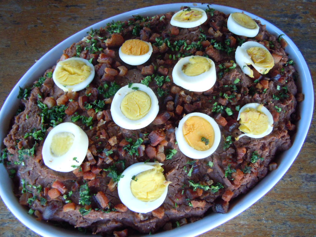 ベイクドビーンズ(インゲン豆)、ベーコン、小麦粉で作る料理